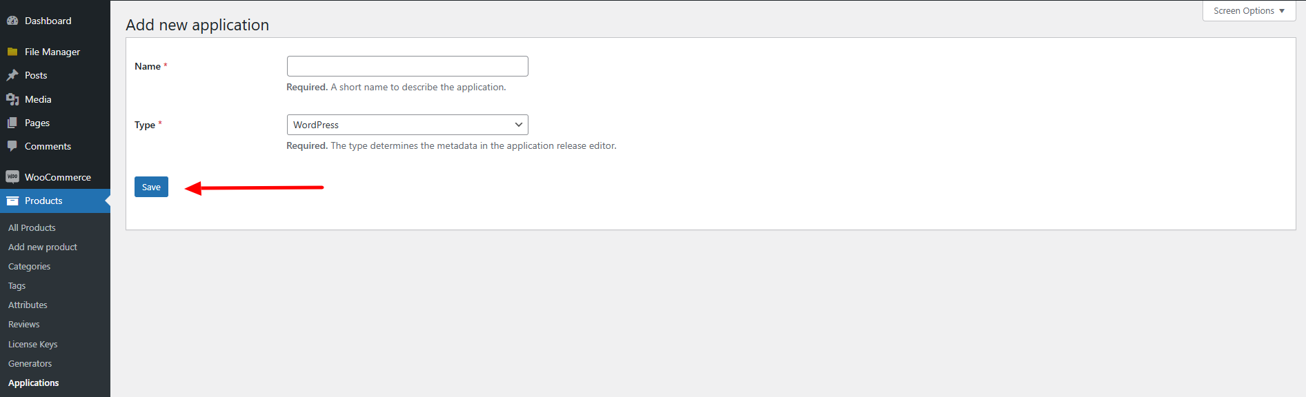 This will open the Application Page. Enter the application’s name and select the application type from the drop-down menu. Click on Save.